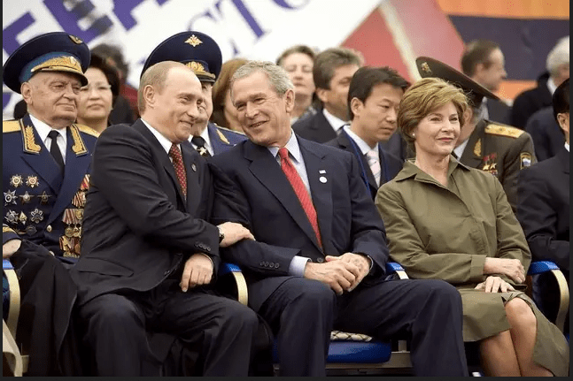 Владимир Путин и Джордж Буш Младши на военен парад в Москва през 2005г. (а на третия ред по диагонал се вижда и тогавашният български президент Георги Първанов)